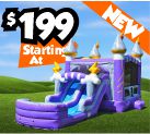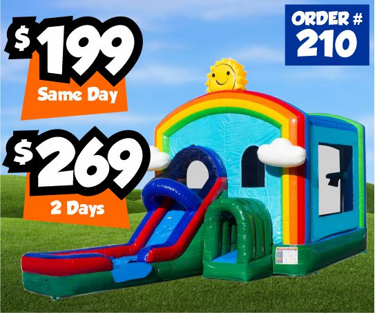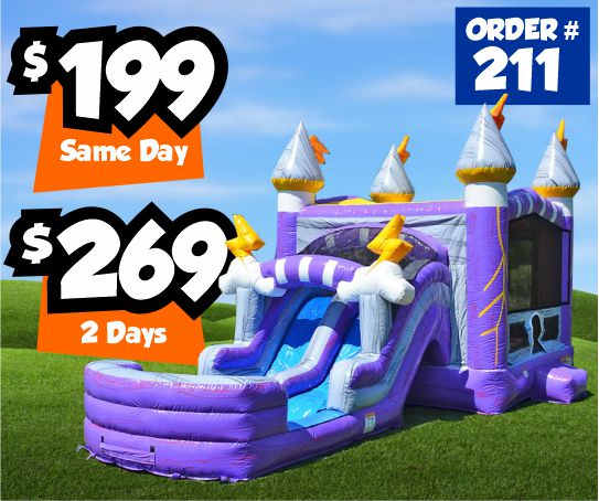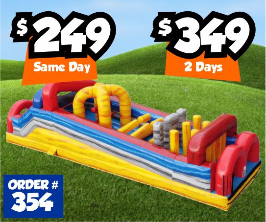 Has area to bounce, pop up obstacles, basketball hoop (balls are NOT included), and a slide.Dimensions: 31'L x 13'W x 15'H