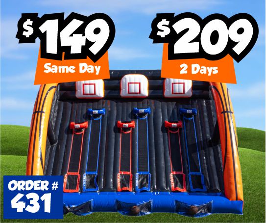 Has area to bounce, pop up obstacles, basketball hoop (balls are NOT included), and a pair of slides.Dimensions: 31'L x 13'W x 15'H